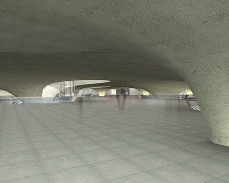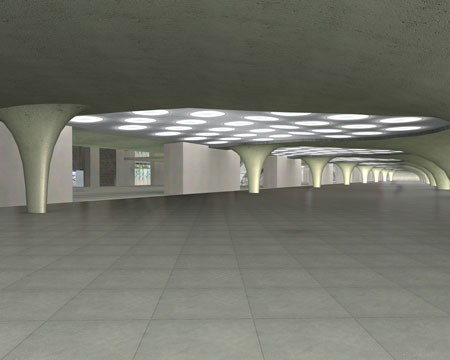 Die grandiose Kopfbahnsteighalle wird in ihrer Funktion durch die „Verteilerebene“ des Tiefbahnhofs ersetzt, erdrückend niedrig und mit dicken Säulen vollgestellt (Visualisierung).
